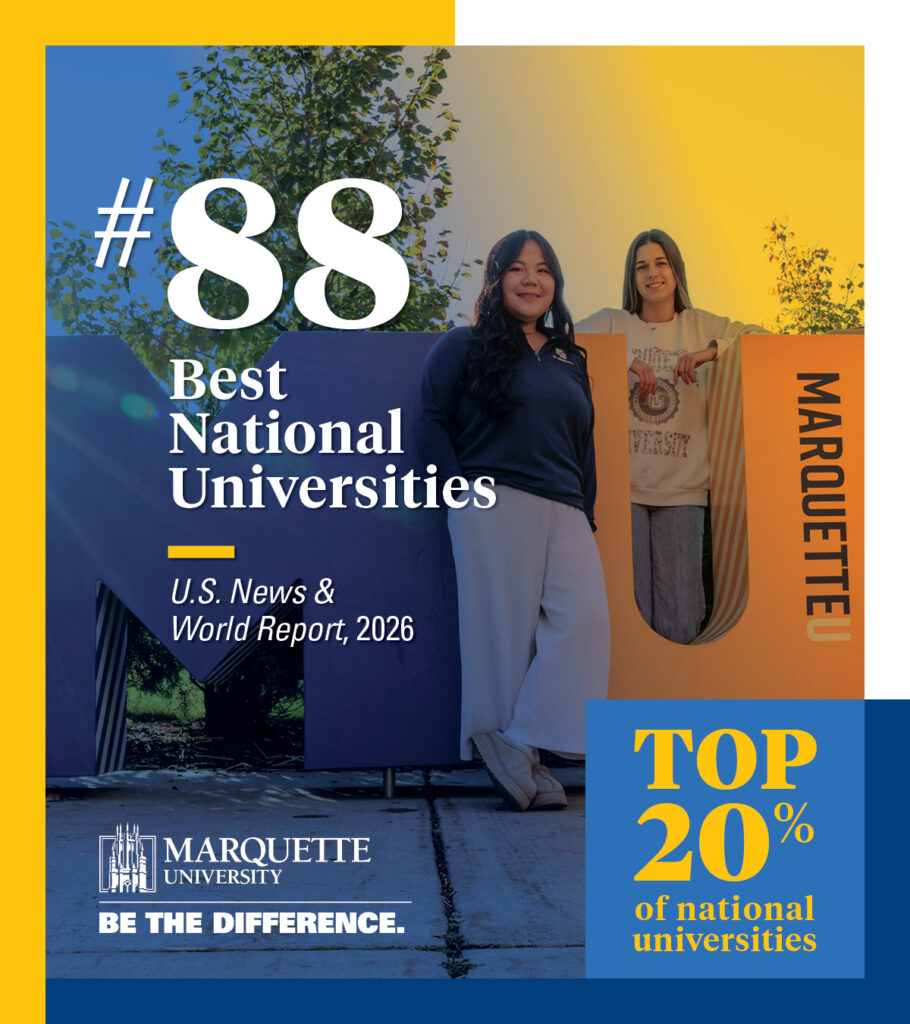 Marquette is ranked in the top 20% among national universities at No. 88 in the latest U.S. News & World Report Best Colleges rankings. Marquette is tied with eight schools: American University; Baylor University; Howard University; Rochester Institute of Technology; Southern Methodist University; University of California, Santa Cruz; University of Delaware; and the University of South Florida.
