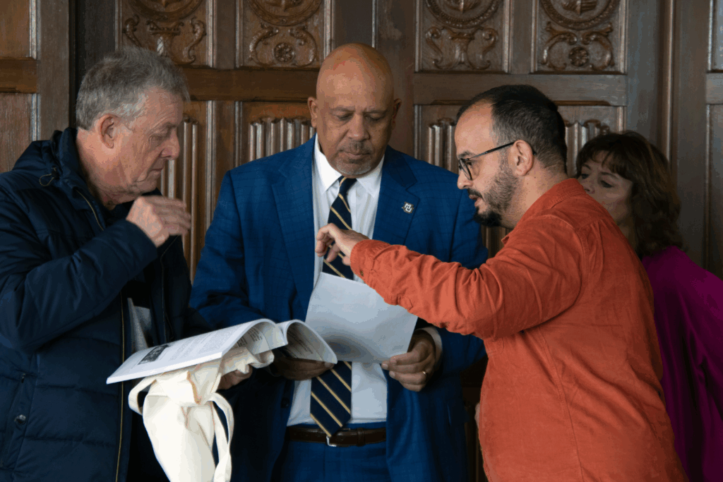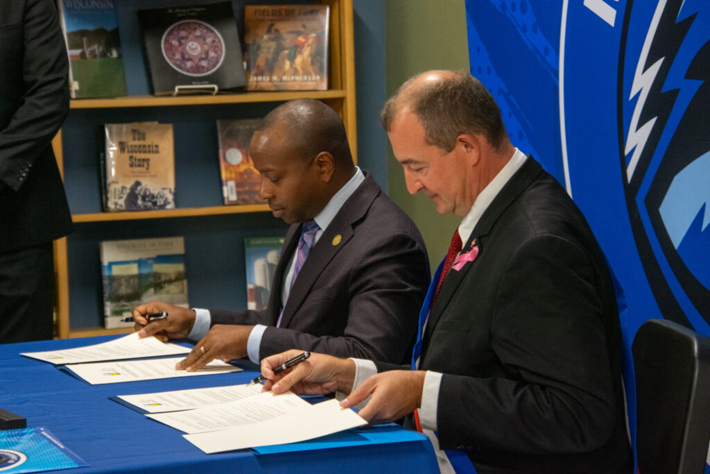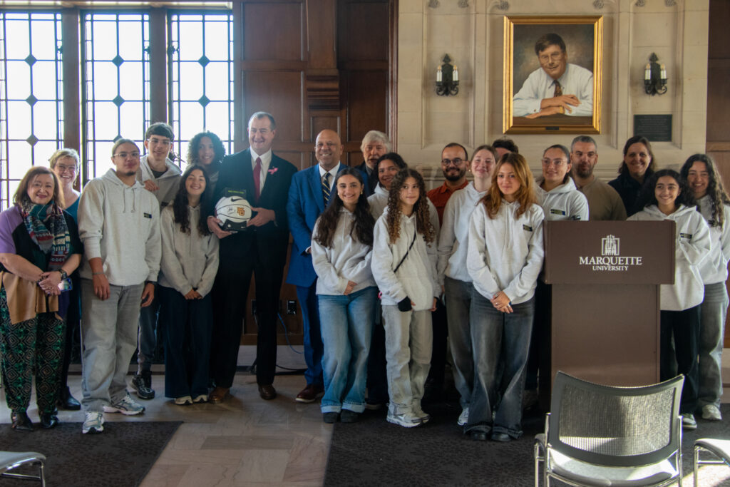 At the Milwaukee School of Languages, the mayors of Milwaukee and Chasse-sur-Rhône signed a charter of friendship between the two cities. Marquette French students Genel Jaffer, Mina Marsolek-Bonnet and Bella Gruber had the opportunity to meet Milwaukee Mayor Cavalier Johnson and represent Marquette at the signing. They were joined by Marquette French department faculty Drs. Sally Gendron and Jennifer Vanderheyden.