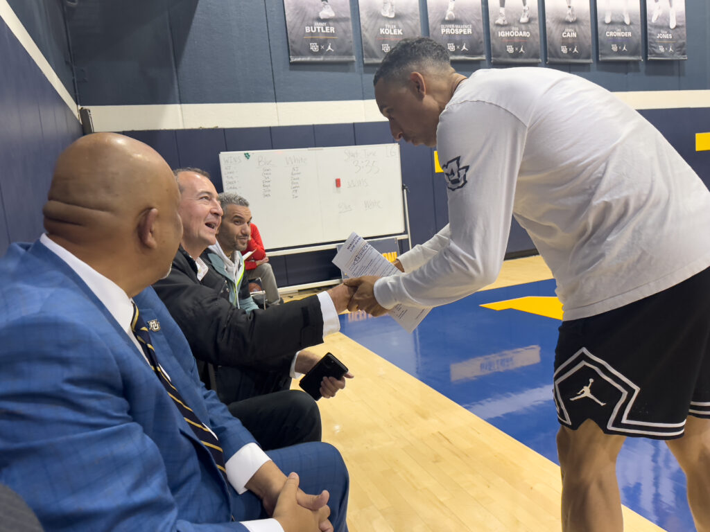 President Ah Yun presented Chasse-sur-Rhône mayor Christophe Bouvier with a Marquette Basketball souvenir and invited the avid basketball fan to attend men’s basketball practice.