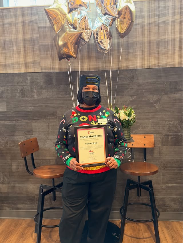 Anyone who has visited The Commons is sure to know Cynthia Byrd, aka “Ms. Cynthia,” whose smile and affirmations brighten the day. Ms. Cynthia recently received a national Sodexo THX (Thanks for Making My Day) Award for the month of October. It’s no surprise she received 2,000 nominations, which the Sodexo CEO claims is one of the highest totals ever received for the award!
