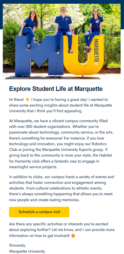 Take, for example, a recent prospect at the top of the funnel who received 10 emails from Kiera over a multi-month period. The student opened eight of those emails, providing insights that the student is interested in STEM and student life. Kiera then emphasized opportunities such as Marquette’s STEM majors, engineering clubs and organizations like Global Brigades.