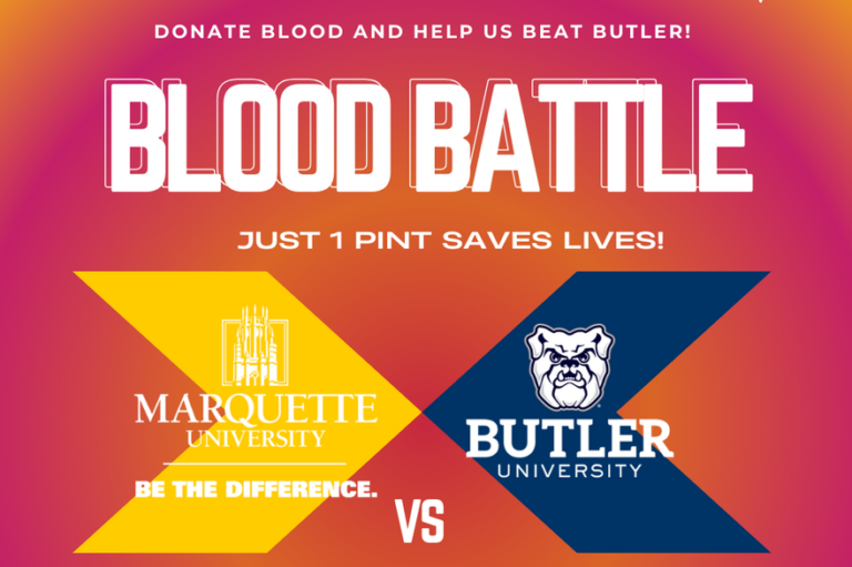 Marquette and Versiti Blood Center will host a blood donation drive as part of Marquette’s ongoing competition with Butler University on Tuesday, March 24, from 1:15 p.m. to 5:45 p.m. on court four at the Wellness + Helfaer Recreation facility.