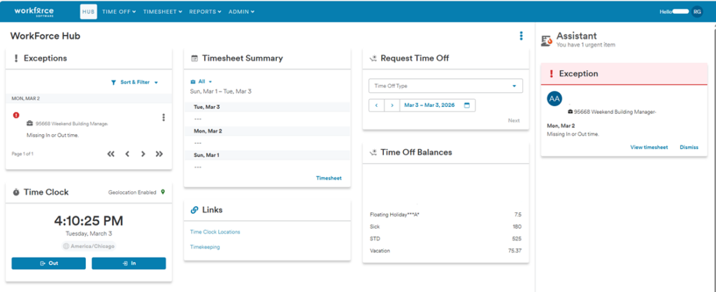 Another change is the introduction of assistant messages to help identify and resolve common issues more easily. These messages may appear when entering time or reviewing records, alerting you to items such as missed punches, I-9 reminders and time-off requests.