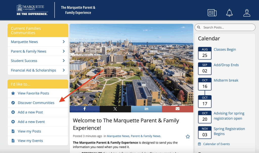 The Marquette Parent & Family Experience is designed to match families’ and their students’ interests, offering a personalized news feed focused on the communities that matter most to them. Managed by Marquette staff and partner company CampusESP, the portal allows users to comment on posts, ask questions and find helpful links to campus resources. Users can also opt in to receive announcements by email or text to stay as up to date as possible regarding campus news, activities, events and important deadlines.