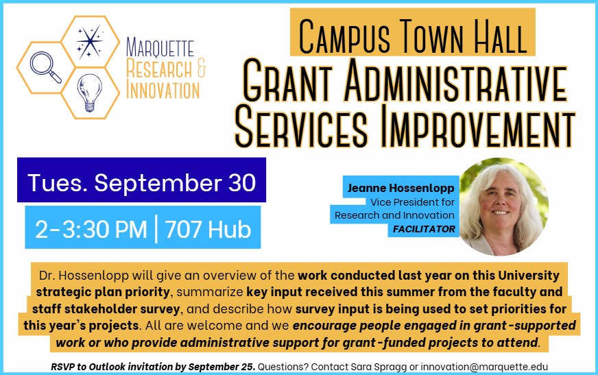 The Office of Research and Innovation and the Post-Award Committee will host a campus town hall on the grant administration services improvement process and updates on Tuesday, Sept. 30, from 2 p.m. to 3:30 p.m. in the 707 Hub.