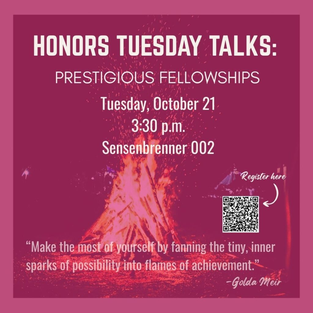 Join the University Honors Program for an Honors Tuesday Talk on prestigious fellowship opportunities on Tuesday, Oct. 21, at 3:30 p.m. in Sensenbrenner Hall 002.