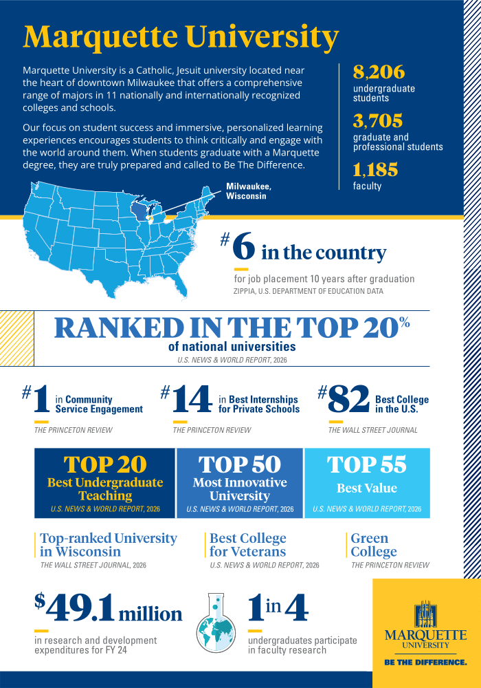 - Key indicators of institutional quality and the value of a Marquette Education, including rankings in undergraduate teaching, innovation, value and community-service engagement.