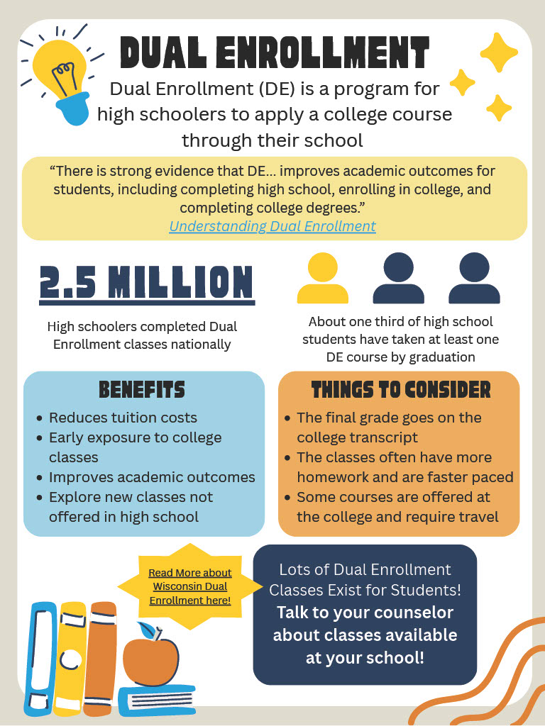According to a July 2025 Wisconsin Policy Forum report on dual enrollment, “Providing students with opportunities for college or university coursework is a priority for Wisconsin, as demonstrated by its inclusion on the state’s school report cards and its popular adoption across high schools. Dual enrollment is the most widespread of these programs and has been steadily growing for the past decade, perhaps due to the range of benefits that dual enrollment programs offer students and schools.”