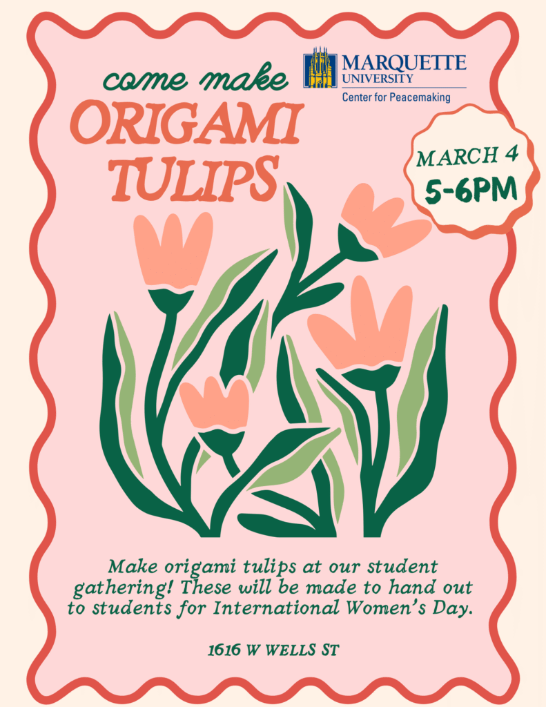 The Center for Peacemaking will host an origami tulip–making gathering on Wednesday, March 4, from 5 p.m. to 6 p.m. in the center (1616 W. Wells St.).