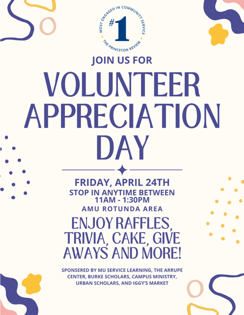 Stop by the second-floor rotunda of the Alumni Memorial Union to join the volunteer appreciation celebration and recognize the contributions Marquette University students make in the local community on Friday, April 24, from 11 a.m. to 1:30 p.m.