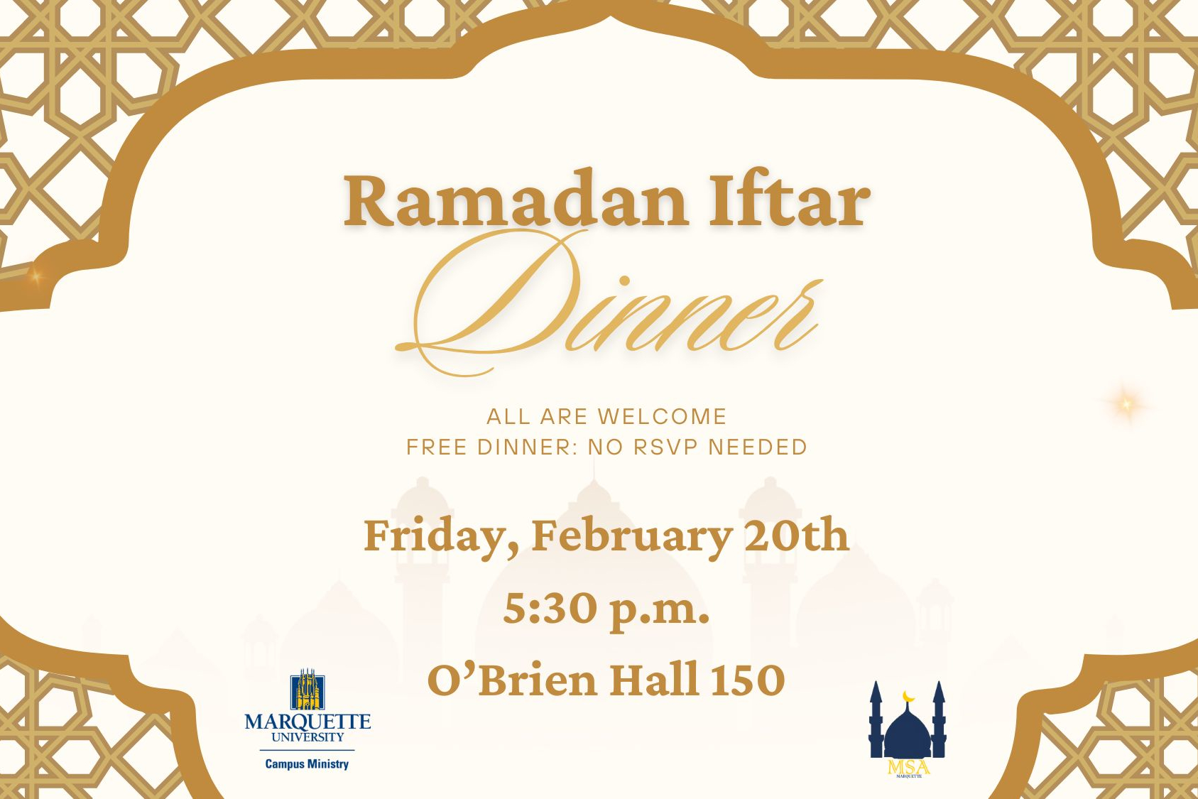 All members of the Marquette community are invited to a free Iftar dinner, which marks the breaking of the daily fast for Muslims during Ramadan.