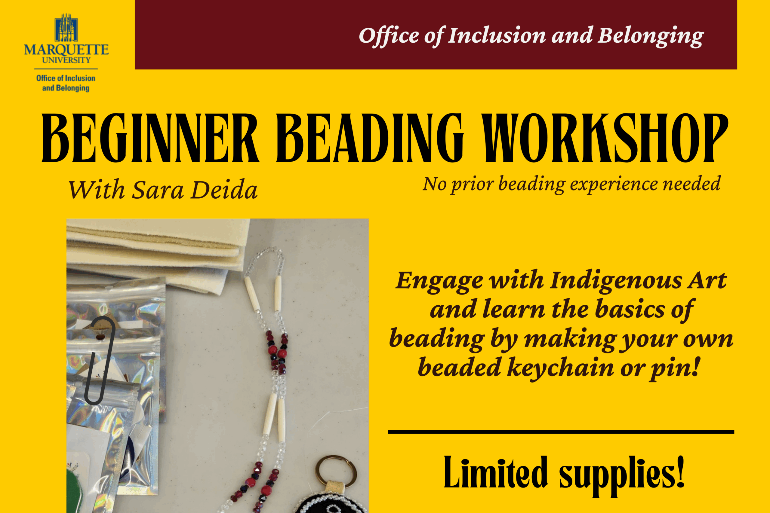 Students are invited to a beginner’s beading workshop with Sara Deida on Monday, Nov. 10, from 4 p.m. to 6:30 p.m. in the Center for Engagement and Inclusion (AMU 111). Participants will learn the basics of beading and engage in Indigenous art, with the opportunity to complete one beaded keychain or pin during the session.…