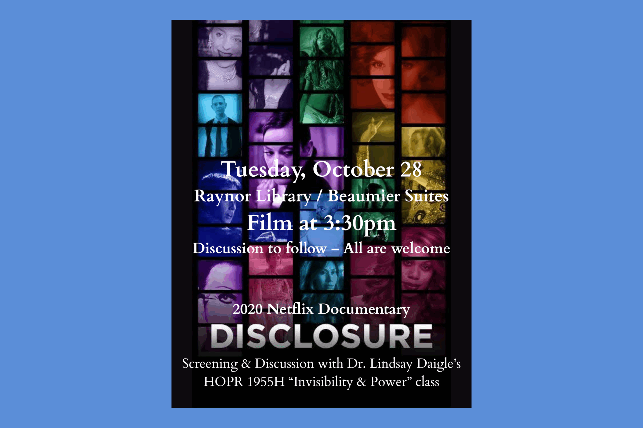 Marquette students, staff and faculty are invited to join Dr. Lindsay Daigle’s HOPR 1955H “Invisibility and Power” class for a screening and discussion of the 2020 Netflix documentary, “Disclosure: Trans Lives on Screen,” on Tuesday, Oct. 28, in the Raynor Library Beaumier Suites. The screening will begin at 3:30 p.m. and will be followed by…