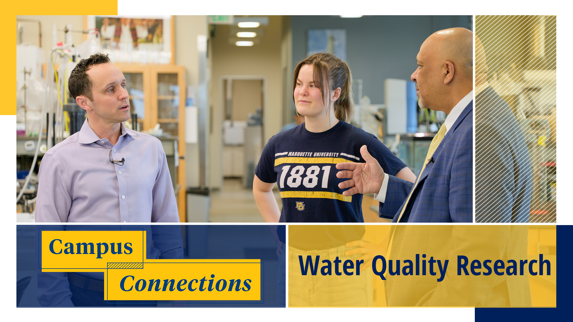 Dr. Patrick McNamara, professor of civil, construction and environmental engineering, and doctoral student Jessie Calteux welcomed President Kimo Ah Yun to the Binsfeld Water Quality Laboratory to learn about their research.