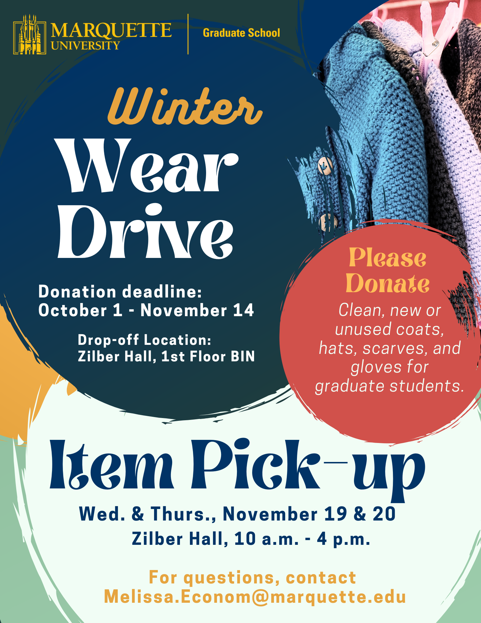 Do you have an extra winter coat in your closet that you don’t wear, or new or gently used scarves, hats, and gloves? If so, consider donating them to the upcoming winter wear drive for graduate students. The Winter Wear Drive begins Wednesday, October 1 through Friday, November 14, 2025. Individuals are encouraged to drop…