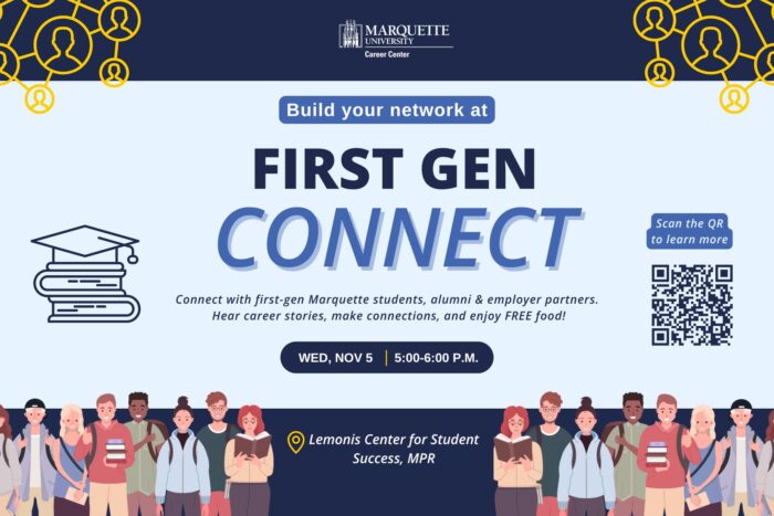The Career Center invites all undergraduate and graduate first-generation college students to an evening of storytelling and conversation with first-gen Marquette community members, alumni and guests from employer partners on Tuesday, Nov. 5, from 5 p.m. to 6 p.m. in the Lemonis Center multipurpose room.