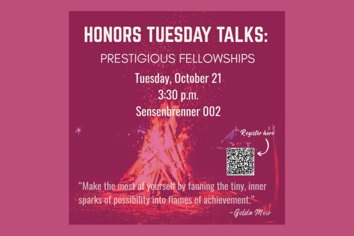 Join the University Honors Program for an Honors Tuesday Talk on prestigious fellowship opportunities on Tuesday, Oct. 21, at 3:30 p.m. in Sensenbrenner Hall 002.