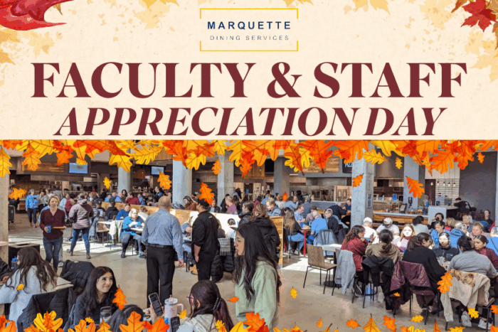 Free lunch will be served to faculty and staff on Tuesday, Oct. 7, from 11 a.m. to 4 p.m. in The Commons, Cobeen Hall, Schroeder Hall and Straz Hall. Faculty and staff must bring their Marquette ID.