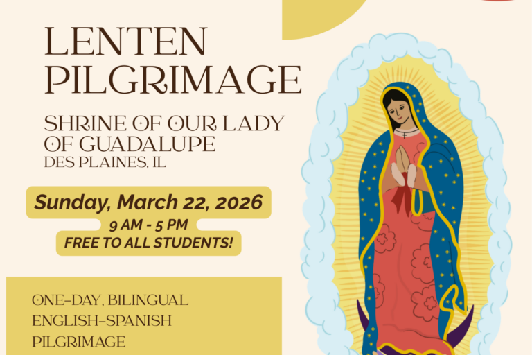 Join Campus Ministry for a free, one-day bilingual pilgrimage to the Shrine of Our Lady of Guadalupe in Des Plaines, Illinois, on Sunday, March 22, from 9 a.m. to 5 p.m. Transportation and lunch will be provided. Space is limited; register online by Monday, March 16. For more information, contact Cecille Medina-Maldonado.