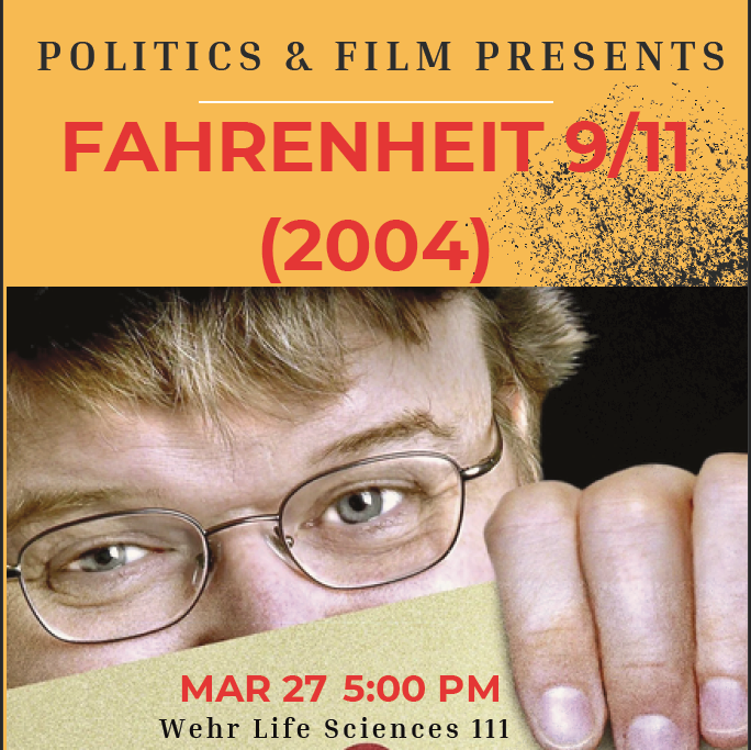 Politics & Film will present Michael Moore’s award-winning documentary “Fahrenheit 9/11” (2004) on Friday, March 27, at 5 p.m. in Wehr Life Sciences 111.